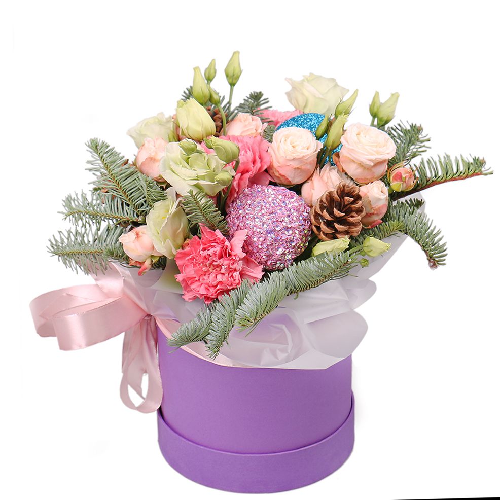 • Склад: Троянди кущові рожеві (2 шт.) · Еустома біла (2 шт.) · Гвоздика рожева (3 шт.) · Новорічні кульки (2 шт.) · Шишки (3 шт.) · Оазис · Коробка кругла S 13x14 см · стрічка · Гілочка ялинки (5 шт.)