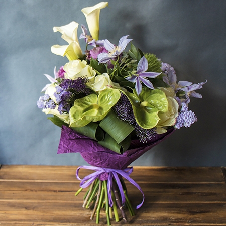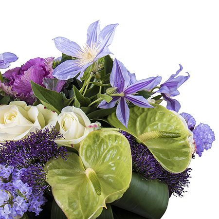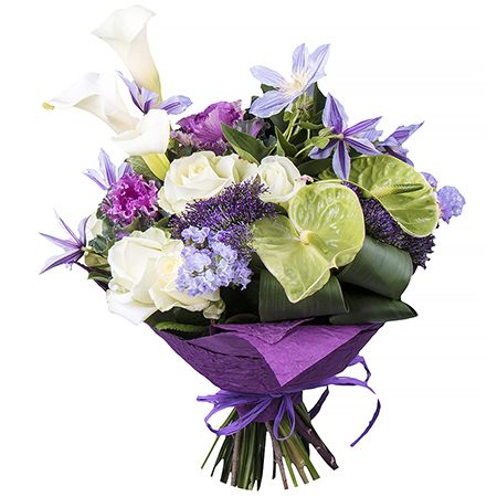 • Состав: Клематис (2 шт.) · Антуриум зелёный (2 шт.) · Калла белая (3 шт.) · Гвоздика зелёная (2 шт.) · Роза белая местная до 60 см (5 шт.) · Бруния (2 шт.) · Статица синяя (2 шт.) · Упаковать букет цветов · Лента на цветы · Трахелиум фиолетовый (2 шт.) · Брассика фиолетовая (2 шт.)